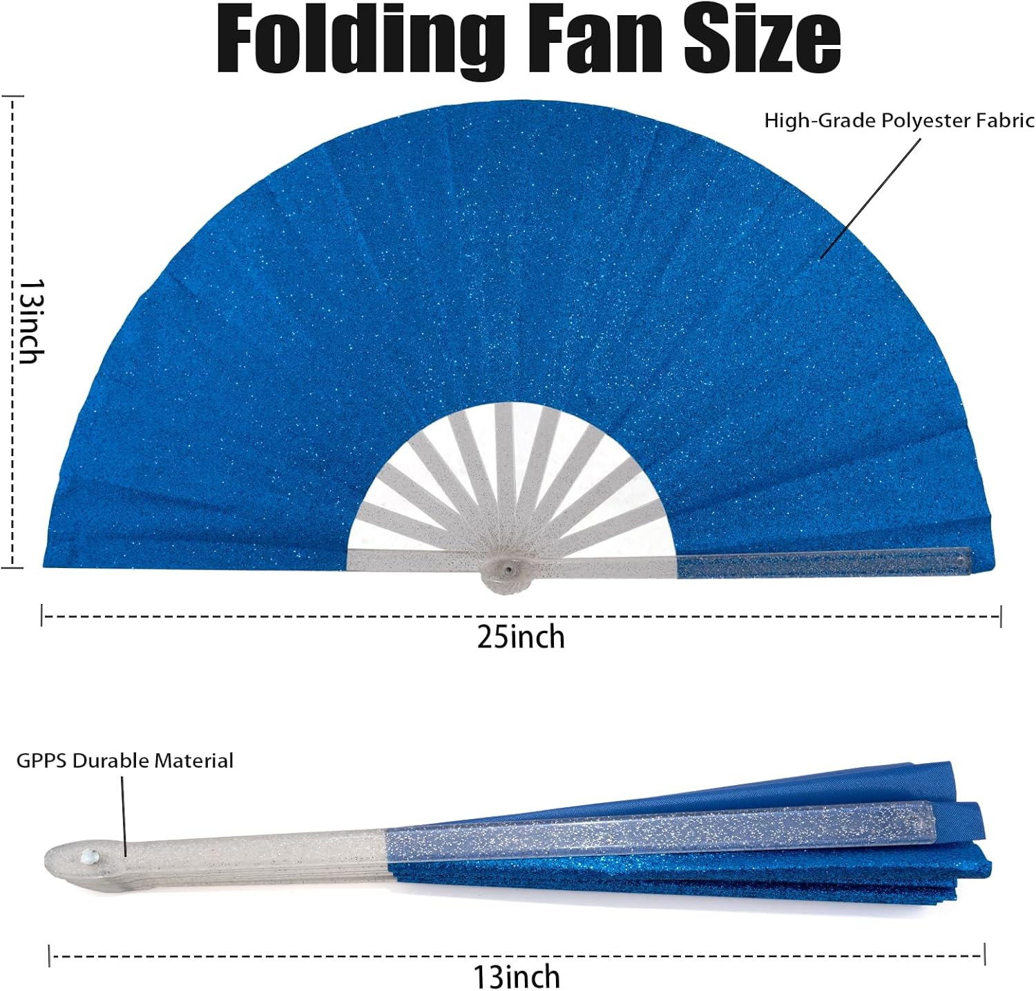 Make a bold statement with the 13-Inch Foldable Hand Fan, a dazzling and functional accessory perfect for raves, festivals, dance performances, and home décor. This fan is made of shiny polyester fabric and GPPS structure, which is both stylish and durable. This fan has a unique design with a flashing effect, shining brightly under the light and making a unique "click" sound when turned on.. Measuring 26 inches when open, it delivers powerful airflow to keep you cool during summer nights or crowded events. Whether you're heading to a music festival, preparing for a line dance performance, or looking for a decorative fan for your home, this foldable hand fan is the ultimate choice. Available in 10 vibrant colors and perfect for gifting to ravers, dancers, or party lovers.