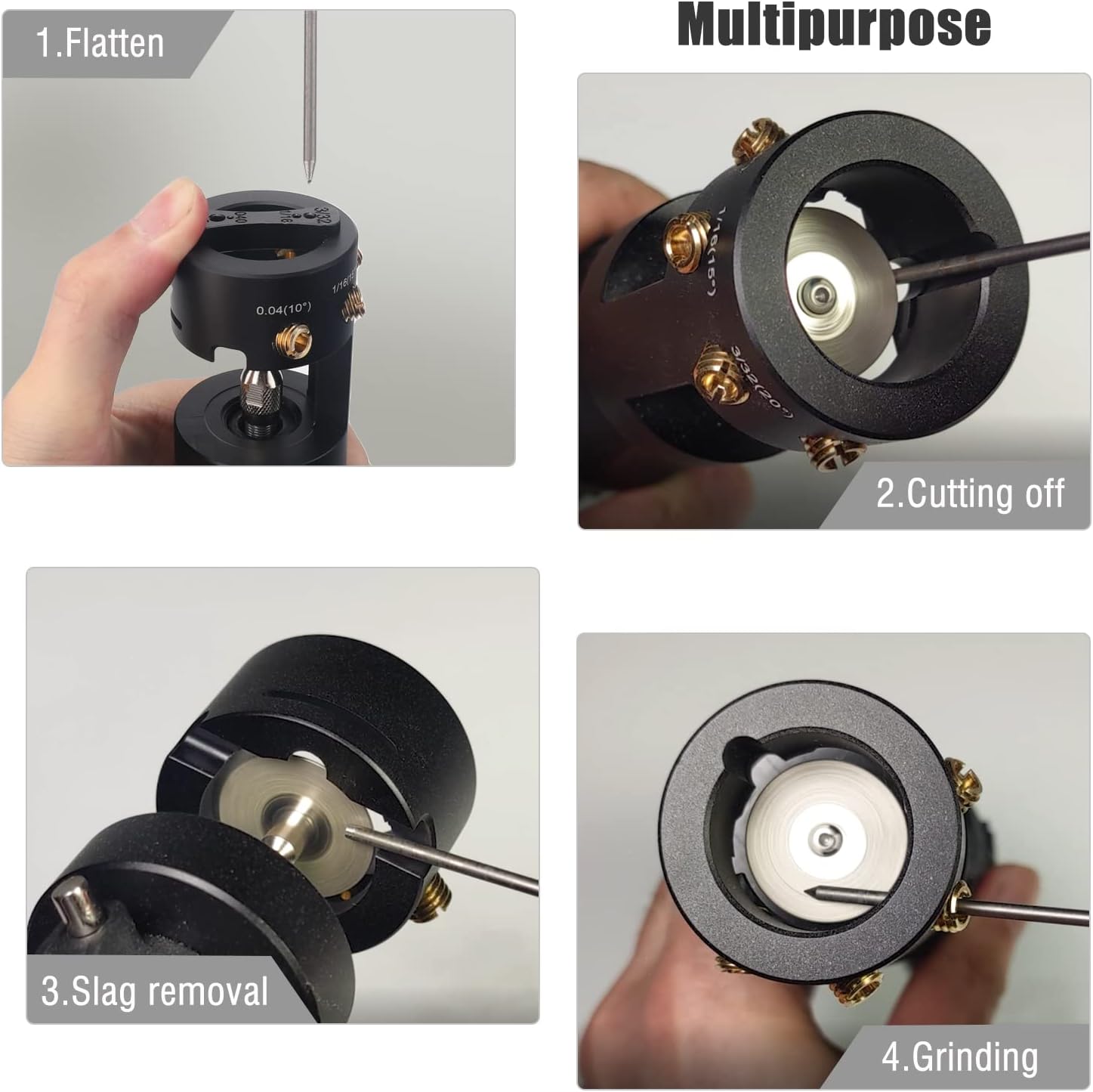 | Included Components | Tungsten Electrode Sharpener, Electric Rotary Tool, 4 Brass Tungsten Guide Screws, 25mm New double-sided diamond grinding wheels, tungsten grinding head tool, tungsten cut-off port, Flat Grinding Block |