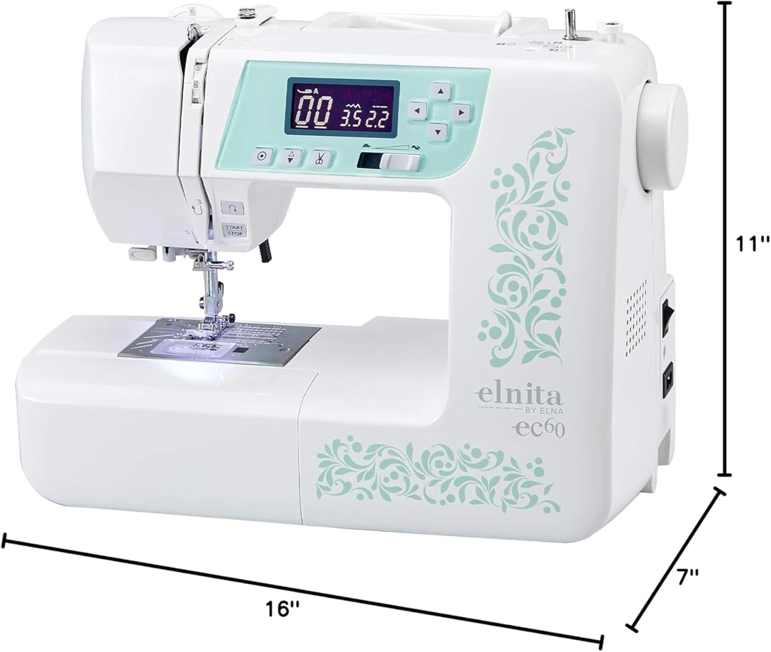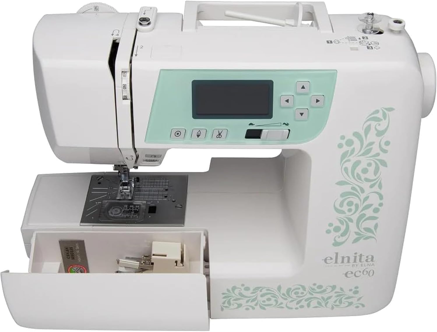 A full-featured machine made with a quilter’s needs in mind, the ec60 was designed to suit multiple applications and purposes. You’ll find 60 stitches including a memory buttonhole. And the time saving features including memorized needle up/down, one hand needle threader, and lock stitch button make sewing easy.