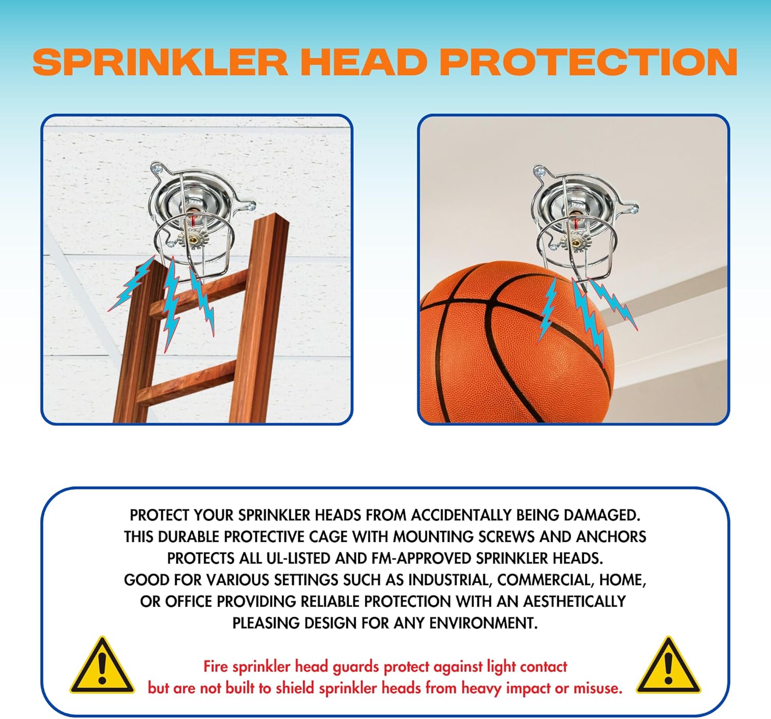 This fire sprinkler head guard is a highly durable and essential protective cage, specifically engineered to shield your fire sprinkler heads from accidental bumps, unintended light contact, and potential damage from surrounding activities. Acting as a robust sprinkler guard, it reduces the risk of costly repairs or replacements due to minor impacts that commonly occur in both residential and commercial settings. Crafted with precision from heavy-duty, corrosion-resistant steel sprinkler wire, the guard’s welded design ensures enduring strength and reliability, even in high-traffic environments or areas where incidental contact with sprinklers is likely. Designed to fit flush mount, sidewall, and semi-recessed sprinkler heads, this versatile guard adapts to various installation types and ceiling configurations. Its user-friendly installation process makes it simple to add an extra layer of protection without interfering with the sprinkler's functionality or design. Compatible with major fire sprinkler brands like Tyco, Viking, Globe, and Reliable, it offers universal adaptability, ensuring seamless integration with existing systems. This sprinkler head guard is particularly suitable for areas that require light protection without compromising accessibility, such as hallways, gyms, warehouses, apartments, and offices. However, it’s important to note that while it provides excellent protection against minor contacts, it is not intended to guard against direct impacts, deliberate misuse, or exposed sprinkler heads. Therefore, if your application requires protection in a high-risk or high-impact area, additional safety measures may be advisable. With its practical design and sturdy construction, this fire sprinkler head guard is an invaluable investment for anyone looking to add longevity and safety to their fire sprinkler system. Ideal for any setting, it offers peace of mind by protecting your fire safety equipment from daily wear.