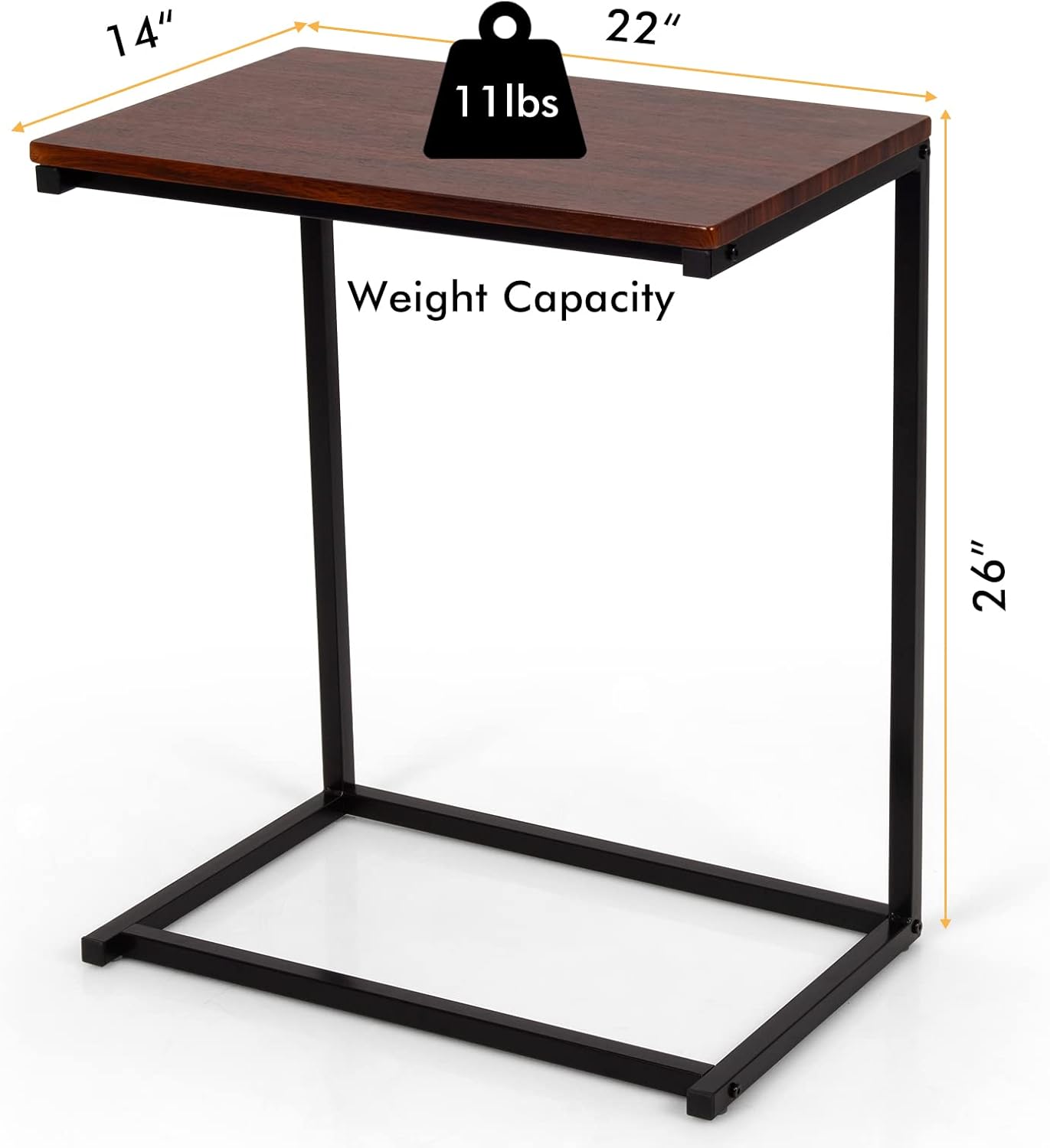 Description:This laptop holder can be a fine decoration of your room.This side table is really stylish and the aninnovative design which makes it gorgeous. Made of steel pipe and wood, it is very sturdy, which can serve you for a longtime. This side table is very useful. You can place it beside your sofa or bedand put certain things that you need on it. For example, you can put your laptop, snacks, cups, magazines, etc. It is really convenient for you to do so.And you have enough space to put your little things.Don't hesitate! Come and buy one!Feature:Easy to cleanGreat weight capacity:250lbsDurable ironframe & MDF topEasy to uselaptop by sofa & bedPerfect for office & home useSimple and mondern designStable construction designSpecifications:Color: black(tubes); walnut(MDF)Material: iron tubes, MDF desktopOverall dimensions: 22”x14”x26”(LXWXH)Size of square tube: 20(W)x20(W)x0.8(Thickness)inchThickness of MDF: 15.0mm