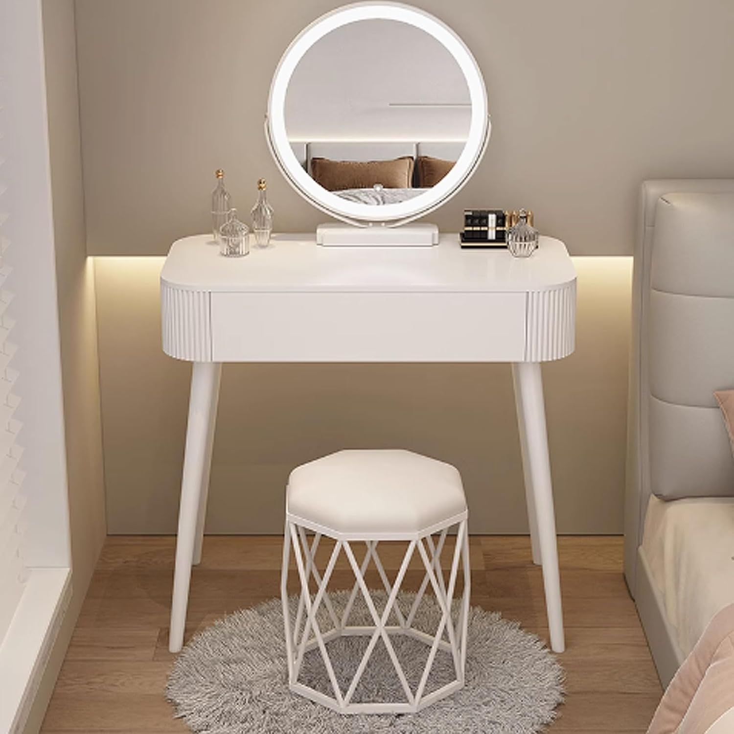 GUQASDV makeup desk with mirror is really suitable to use in makeup room, bedroom, living room and balcony to offer a better makeup experienceEasy cleaning: all the pannels are wrapped thoughtfully by waterproof surface, the cleaning of vanity set with mirror and stool is easy just need to wipeEasy installation: the installation of makeup desk with mirror small will be really easy to install with complete accessories in the package, just need to tight the screwsMaterial: Engineered Wood + Solid WoodColor: whiteMakeup mirror: makeup mirror with lightsMake up vanity stool: birdnest stool, round stool, petal chairSize: 80x40x78cm, 100x40x78cmNote: 01 There may be a 3-5cm error in manual measurement, which is normal, please understand02 Due to different displays or shooting environments, the product may have color differences, please understand