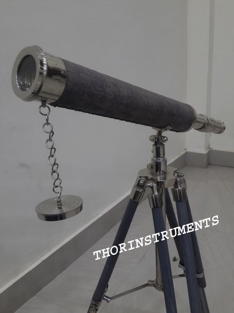 The Floor Standing Brass Telescope 18" is a beautiful, brass, refactor telescope mounted on a wooden tripod. This telescope is a fully functioning nautical masterpiece that adds class and sophistication to any room it's in. This is a perfect nautical gift for the explorer in your life. The main scope is solid antique brass, which shines beautifully when placed in the sunlight