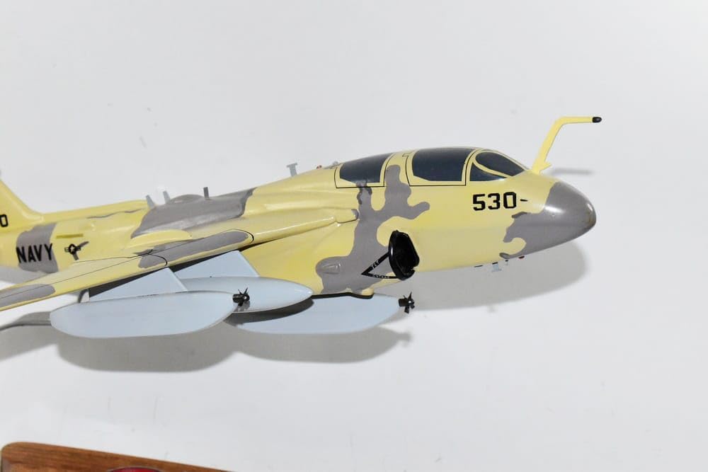 VAQ-133 Wizards EA-6b (161120) ModelFly off the USS John F Kennedy again with the VAQ-133 Wizards in this 18 inch wooden model. Each model is carefully carved and painted to provide a unique piece that you'll treasure.Length - 18 inchesMade from MahoganyUS Veteran Owned BusinessMarch 4, 1969; established at Naval Air Station Alameda, California. Originally flew the EKA-3B Skywarrior.- August 1969; and again in November 1970 the squadron departed for combat deployments to Southeast Asia onboard USS CONSTELLATION (CV 64) and USS KITTY HAWK (CV 63).- August 1971; relocated to our current homeport, NAS Whidbey Island and transitioned to the EA-6B Prowler.- January 1974; VAQ-133 departed Norfolk, Virginia onboard USS AMERICA (CV 66). This marked the first ever Prowler deployment to the Mediterranean Sea and the first deployment of the new expanded capability (EXCAP) version of the EA-6B.- 1975; the Wizards completed four months of pre-deployment training on the east coast in preparation for USS JOHN F. KENNEDY's (CV 67) June deployment to the Mediterranean Sea. Once deployed, the Wizards broke every flight hour record for the EA-6B community.- Between November 1979 and October 1981; VAQ-133 deployed to the Mediterranean Sea onboard USS FORRESTAL (CV 59) and USS AMERICA (CV 66).- February 1982; the Wizards conducted refresher training onboard USS ENTERPRISE (CVN 65), and set sail in September for their first WESTPAC deployment as a Prowler Squadron.- 1984; VAQ-133 again deployed onboard CVN 65 and participated in two of the largest naval exercises ever, RIMPAC 84, with over eighty allied ships, and FLEETEX 85-1, with five carrier task forces in two oceans. The squadron returned home in December 1984 and transitioned to the Improved Capability II (ICAP II) version of the EA-6B.- September 1987 and May 1989; VAQ-133 deployed to the Mediterranean Sea onboard USS CORAL SEA (CV 43).- December 1990;